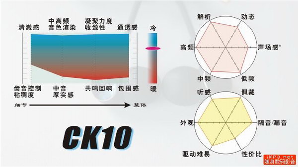 铁三角双单元动铁耳塞力作。极其强大而华丽的做工、体积、外观、佩戴感,高质量偏冷声而三段量感平衡的音色,在各类动铁入耳耳塞中实力居前列的解析、声场感和声音凝聚力,相对高的易驱动性和同价位下相比其他品牌同类音色风格取向的动铁耳塞也不败下风的主流随身听直推素质——从而获得的更好的适用性与实用价值,在同档次动铁入耳耳塞中比较合适的价位,都让其短时期内在广大随身烧友中树立了在众多铁三角随身产品中难得的良好口碑,就连大家坛中最严厉苛刻的器材评论家,恐怕也很难在公允的立场上找到其任何一方面的明显缺陷。CK10让铁三角摆脱了前任CK9某些方面较差评价的阴影,真正跻身高素质动铁入耳耳塞厂商的行列。尽管CK100发售后,CK10不再是铁三角随身耳塞的旗舰型号;但可以预料,CK10将在动铁入耳耳塞的历史中占有自己的一席之地!