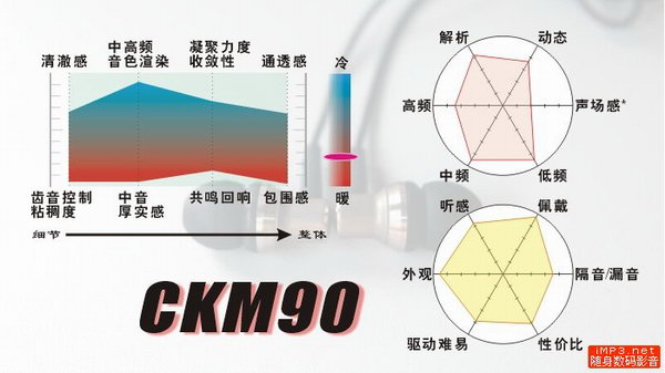 虽然从60毫米的短线、硅胶套配件和极高的灵敏度等设计来看,CKM90明显是针对随身听音乐推出的产品,但奇怪的是51欧的阻抗,让其声音在小推力前端下表现得稍显局促。而在合适的大推力前端下会有不少改善。CKM90的线材比CK9和CK10细,是CM700那种的细线,不过做工仍然OK。另外,非绕耳式的设计让听诊器效应加重,接线控走在路上,耳朵里尽是线材摩擦的噪声。