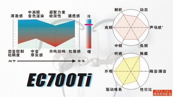 个人感言:刚开始买回来的时候,我一耳朵误把这个塞子听成“很平衡”,实在贻笑大方。现在听来,EC700Ti绝不平衡,我一向自诩为冷声爱好者,但EC700Ti也实在经常让我大热天里不住打冷战——玩笑了,不过确实,这塞子的声音太极致了,我已经不能说它“不好听”,因为你很难在别的牌子里找一个敢做得这么冷、高低两端和中间如此不平衡得如此极端的塞子的说,单就这一点,EC700Ti倒是很值得收藏。我也是把它收着的时间远远多于拿出来听的时间,一方面它的声音适应面太窄,另一方面过亮和尖锐的音色也不适合长时间聆听,尽管它的佩戴是很舒适的。