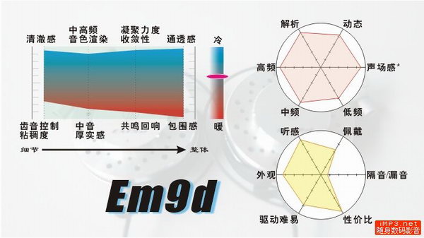 个人感言:似乎EM9r天生就是个入冷宫的命——本来这次评测中并没有EM9r的,当评测开始时,正是在上面说的那种好奇心态驱使下,逼着自己搞了个EM9r来听,并加入到了正式的评测对象中。从总的使用时间来说,算是最短的,也就是主要在这次评测中才拿来仔细听,平时基本还没它出场的份,也就没有留下太深的印象。(后宫佳丽太多,而且本人也不是那么喜新厌旧的主,哈哈哈!)仅仅从这一次评测来看,EM9r还是表现出众、且与其他三款耳挂有很大不同的,最让我意外的是,在《鸟之诗》、《アンインストール》和另几首钢琴为主的BGM的评测中,它竟然获得了最高分!而其他不少试听曲目的得分也紧随EM9d和EW9。看来也是个潜力不小的家伙,日后一定好好发掘一下。