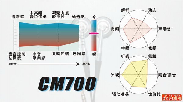 个人感言:相比CM7,我对CM700是怀有更深厚感情的。手上这条CM700听的时间很长了,虽然吧,它也不是那么容易出好声,而且适应面也够窄。相比其他铁系的耳塞耳挂,CM700的表现不是很出彩,但还是喜欢它,就因为这塞子听起来一点不累。比如,睡觉前听一下,很不错。当然了,在这个价位以“中性平和”为声音风格的塞子不少,尤其是欧系的那几款,声势浩大。在这些塞子面前,CM700没什么优势,也不用去争什么。至于有段时间不少人纠缠于“CM7和CM700到底哪个好”,结果就是对后者大肆鞭笞。这又何必。不喜欢一样东西,无视它不就行了;非要通过生拉硬拽的把它跟自己喜欢的东西先入为主的作比较,然后狠狠的踩一番以显示对自己喜欢的那一边的袒护,要我说,这反而显得心虚。