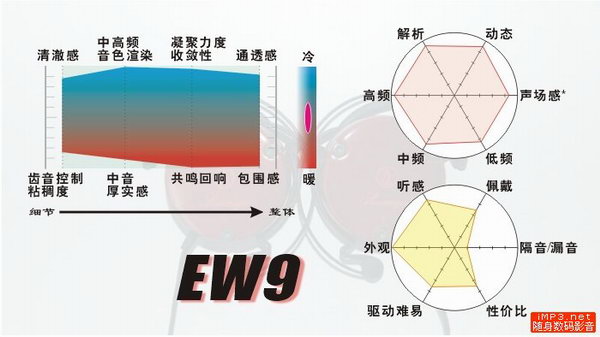 在随身界,EW9的名头就如同一位声名显赫的女王,你不可能不知道她,或许你会不认同她的表现,但你绝对无法忽视她的存在,更不可能忽视她在这个圈子里的出众和另类。无论外表还是内在,EW9都是那么的别致而不拘一格。她的外表是那么的华丽,能让你瞟一眼就念念不忘;她的声音是如此的独特,能让你听上一耳朵就留住余韵三日绕梁……(旁白:喂喂!神棍了!)好吧,其实关于EW9的声音描述,论坛上已经有众多高人出手大作,我在此仅作总结一二:在高素质的三频与音乐表现力下,EW9的音染是从细节到整体通染的类型,而且,无法用简单的冷、暖来表达其音色取向,在不同的音乐类型上,其音色表现或许用“冰火两重天”来描述更为恰当。与此相对应的,“有口皆碑”的是其对前端的挑剔甚至有些“令人发指”,论坛上多位老鸟也曾无奈的表示“为EW9找个合适的前端,真难!”其“女王”的风采昭显无余。而据野史传闻,一旦找到了合适的前端,EW9的声音能够让你舒服到想把她永远留在耳边的地步。原来、原来……这位女王还具有常人难以察觉的“傲娇”属性呢!(燃了!身为OTAKU的本人燃了!)