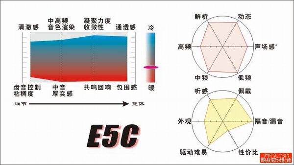 评价:有素质有听感有风格的“三好青年”式经典之作。同样是染得厉害的耳塞,E5C却是和铁三角完全不同的音染类型:“万花筒”般的中低频和低频音色与动态渲染——和其他很多耳塞耳机的不同,E5C对中频和中低频的声音回放音染不仅仅是“加强”音色效果,而且更有一种“再表达”的创造性诠释意味在里面。人声和乐器的彼此共鸣在E5C的丰富表达下,甚至超越了录音师想要表现的内容。E5C的整体氛围和动感也是令人流连不已的经典所在,听着它的声音,你不会更多纠缠于细节表现(尽管它在细节上也具备了动铁的高素质),而是沉浸于音乐本身的感动,不时想要站起来伴歌起舞。