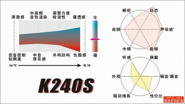 至于K240S的“监听风格”,还是请看该耳机的冷暖线:细节方向上瘦弱的有色区域说明了问题。