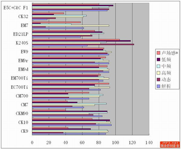 大都是简单的钢琴和钢琴音色为主旋律的轻柔的曲子。(还有几首以吉他和提琴为主)从得分结果来看,最高分通通被耳挂组的三个“9”系的兄弟们给拿了去,只有EM700Ti和耳塞中的CK10紧随其后,其他的都有一定的差距。这其实也不难理解,钢琴音色虽然容易回放,但要放好了那是相当的难,即使我在这个评测中没有对“真实性”有任何要求,打分也以本人喜好按照随身的标准很宽容的给了总体相对其他组高的分数,但事实是钢琴音色需要全频段均衡而高素质的声底来保证。所以,如果需要更进一步的追求的话,恐怕只有动圈大耳机在台式系统上的表现才能够让人足够满意。随身上听钢琴,还是将就一下就得了吧。