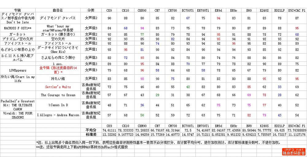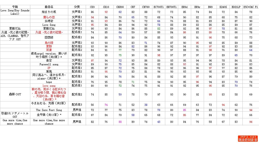 这一组的特点就是唱功很不错,从歌手的介绍都可以看出,她们从小就受过严格和系统的专业训练,在声乐和发音素养上是超出一般的流行歌手的平均水平的。而唱动漫游戏歌曲的女声,大多还是偏高音的类型。在这一组上,铁三角的总体表现可谓大放异彩,除了CKM90或者EC700Ti这种太“偏科”的外,其他大都得到了较高的分数。CK9如愿以偿的仍旧保持总体90分以上的高分,不愧是出街女声之利器;而在这一组上,像CK10这种高解析的塞子也不用担心被歌手的声线反过来“拖后腿”,因此得分也还不错。至于CKM90,虽然在人声上染的还不错,无奈整体极暖的音色让歌曲唱得怎一个闷字了得,因而不少这一组和上一组女声的得分,CKM90都是垫底的可怜分数。